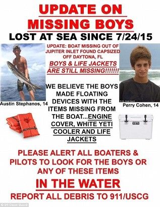Cohen and Stephanos were avid fishermen who often ventured not far offshore. They would routinely check in with their parents every couple of hours. Stephanos's grandfather stated that his grandson had operated the boat about twenty times and that family members were comfortable with him operating the boat. A week before their disappearance, Stephanos had been stopped by a Marine Patrol Officer for a routine check, and all safety equipment mandated by Florida law was aboard the boat.